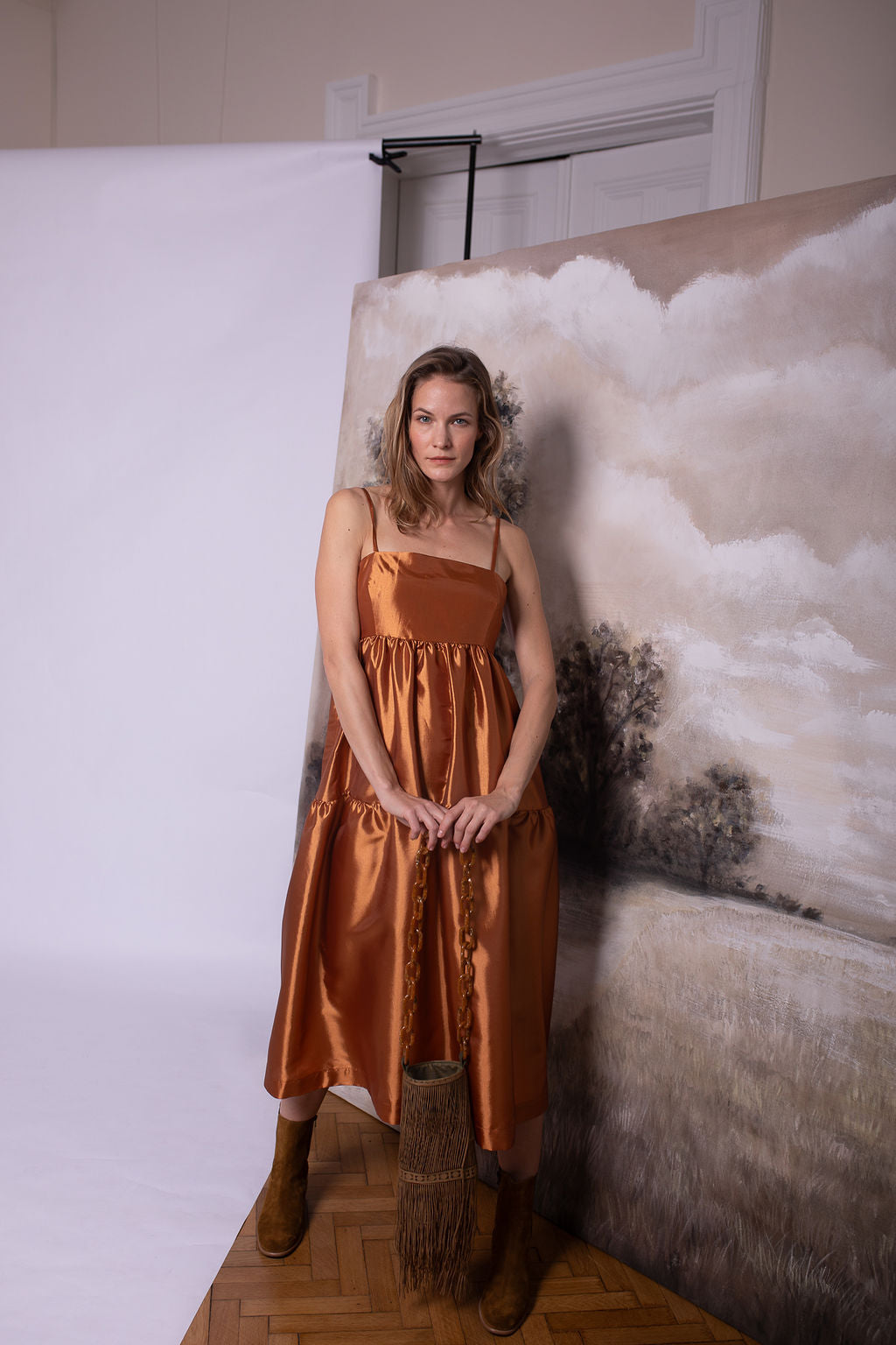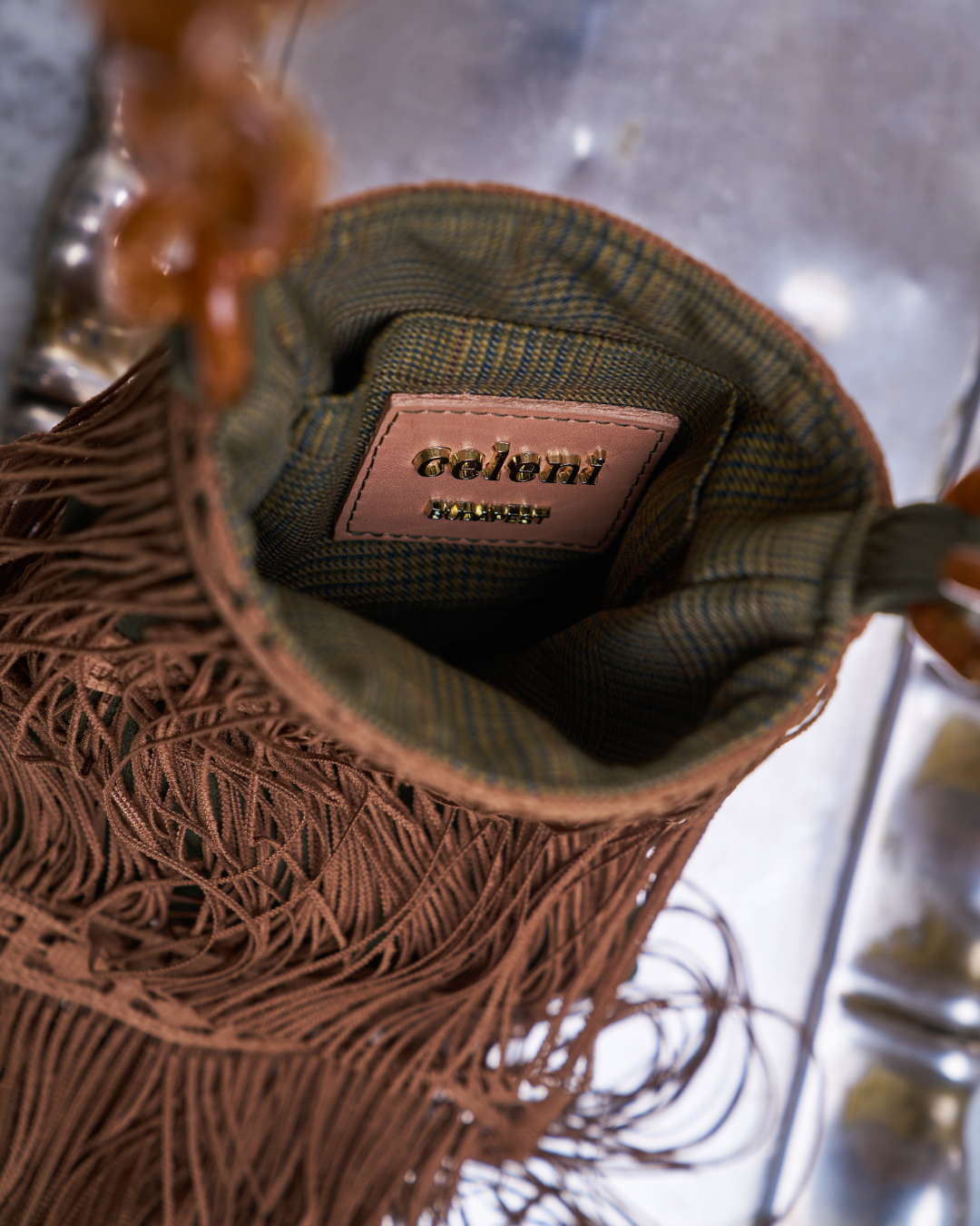 The dress features a contemporary twist with gold-tone fringe details cascading from the shoulders and the waistline, adding movement and modern glamour. The crew neckline and sleeveless design keep the focus on the luxurious details, making it a sophisticated statement piece for any occasion.