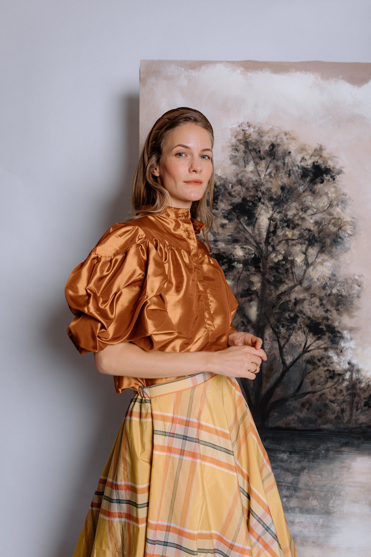 Every Celeni design is carefully made by hand, combining the best of hungarian craftsmanship with the finest materials. This blouse is a loose-fit piece made from ''Cognac'' brown taffeta and it's gathered into puff sleeves and a smartly buttoned Mandarin collar.